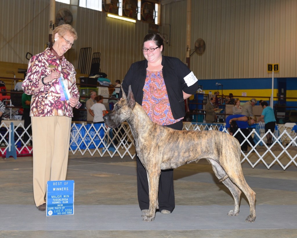 Arya is our foundation from Fendane Great Danes. We greatly appreciate Kathleen Fennell for giving us the opportunity to be owned by this beautiful soul. Arya’s championship was started by professional handler Nikki Holmes. I worked up the courage to get in the ring and gained her last 10 points owner handled. I finished Arya’s Grand Championship completely owner handled.