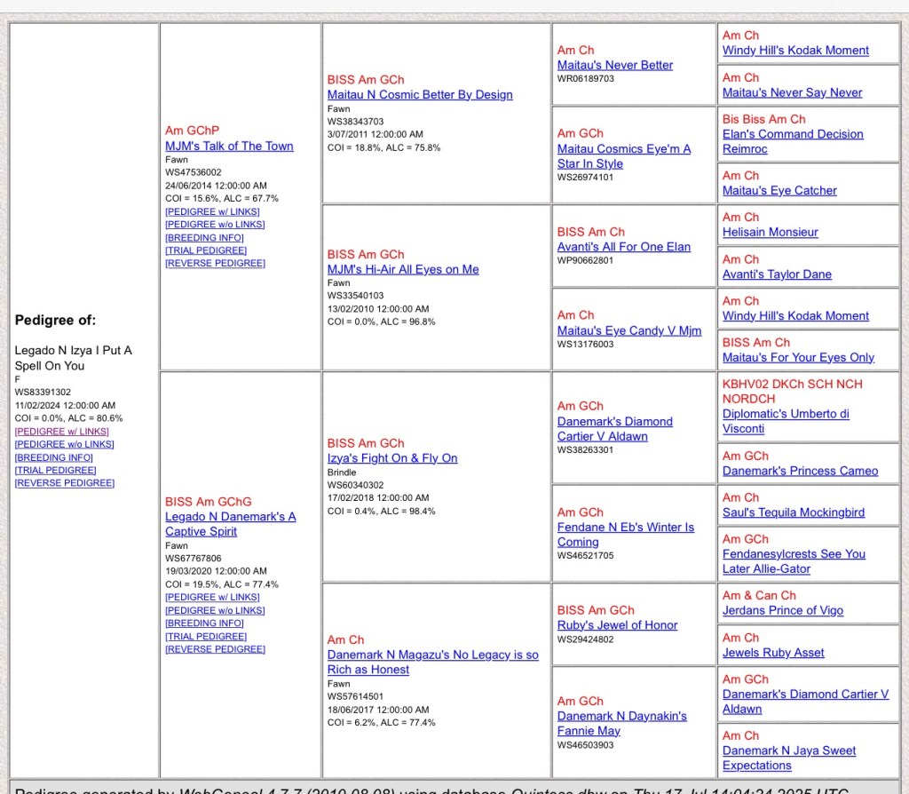Shania is out of Portia , Ch Danemark N Magazu’s No Legacy is as Rich as Honest , and by Baron , GCh IZYA’s Fight On & Fly On. She came out to show at 14 months old and was shown sparingly and finished completely Breeder/Owner handled by 20 months old with 2 specialty majors.